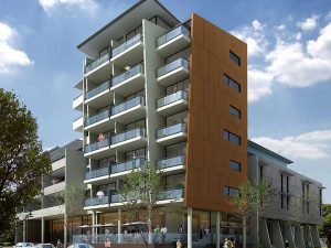 The mixed -use development comprises 32 one two and three-bedroom apartments above a raised ground plane of retail and a prominent corner cafe. Building to the street alignment, the built form pivots around a bold yellow blade giving the development a strong street presence.