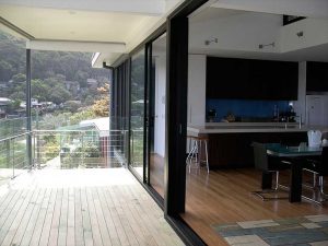 The main living area opens directly off the street frontage providing a level platform extending out to the distant views. High level glazing and the open stairs permit the northern sun to enter the house, with adjustable louvres to control the summer heat.