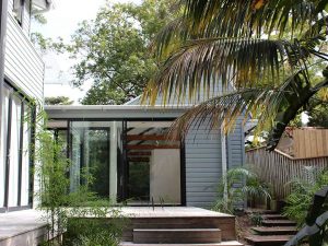 The brief called for an extension to the front of the house with a new entry providing the interface with the existing house. The new bedroom above with projecting glazed corner overlooks the adjoining park, and is screened with external adjustable louvres